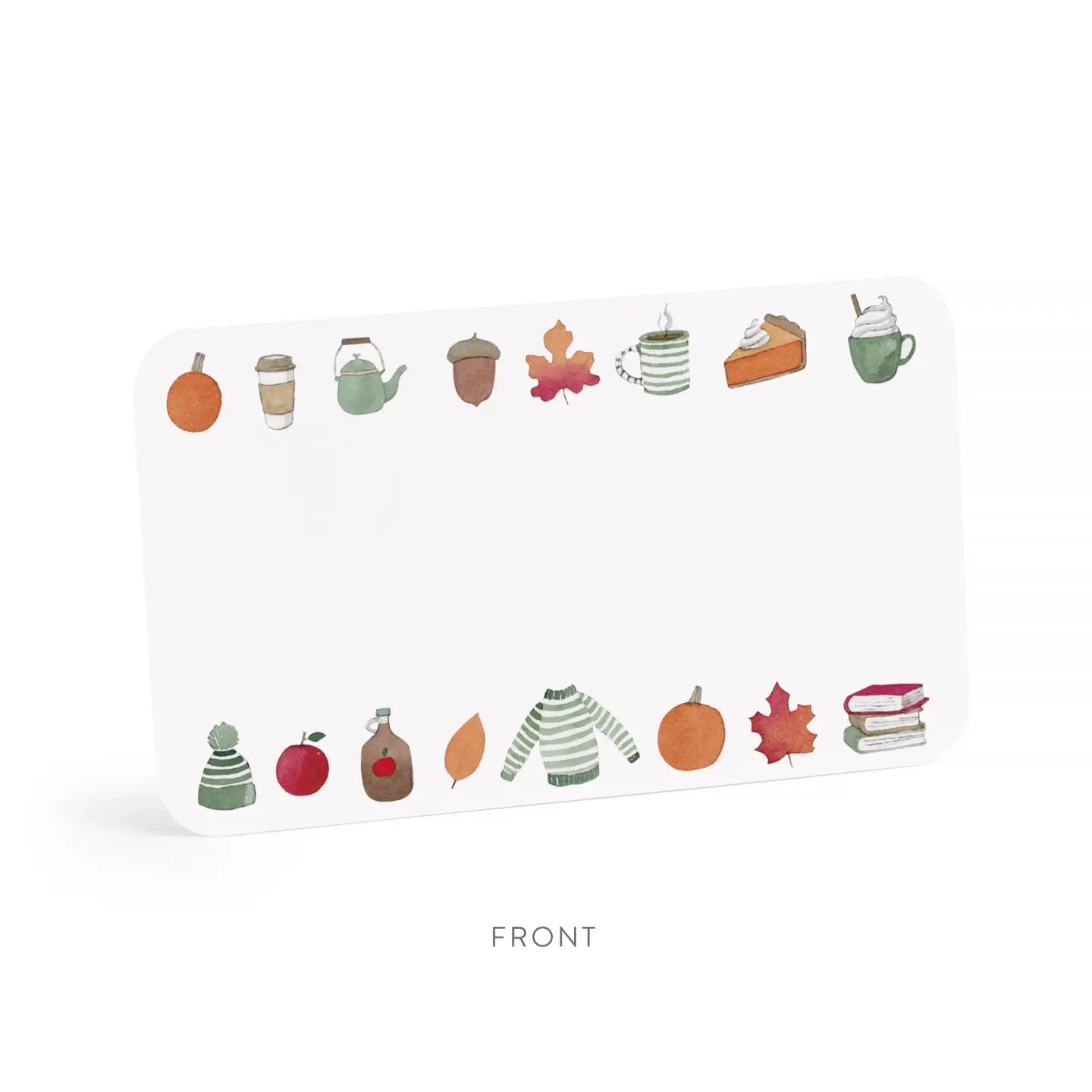 A handy pack of 85 business card sizes flat cards, cozily boxed together for you to use unsparingly as place cards, gift tags, lunchbox notes, teacher notes, and more!