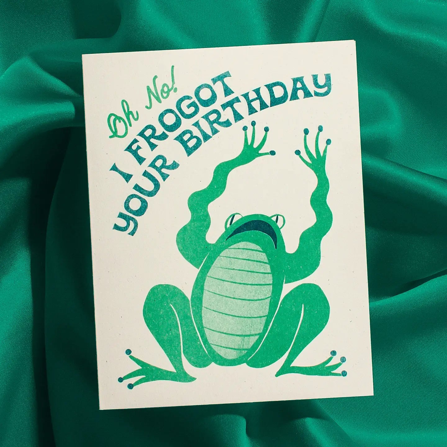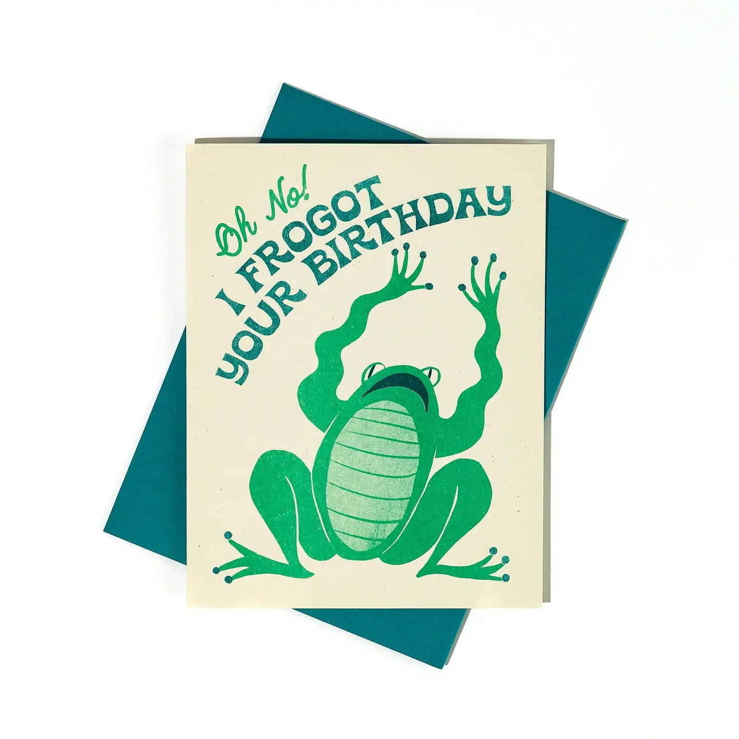 Prone to forgetfulness? Choose this charming belated birthday card featuring a whimsically panicked frog. Better late than never! Risograph printed in seafoam and teal.
