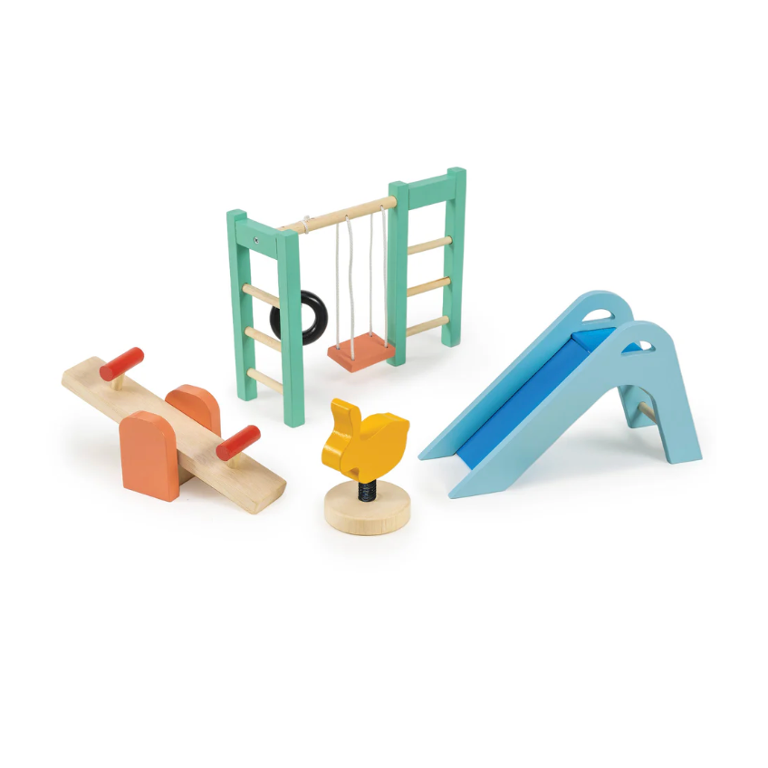 Scaled for dolls house world, this fun outdoor playground set has the most popular activities from playgrounds for your dollies to enjoy! A see-saw, slide, climbing frame, swing and tyre. A bouncy bunny ride-on completes the set!
