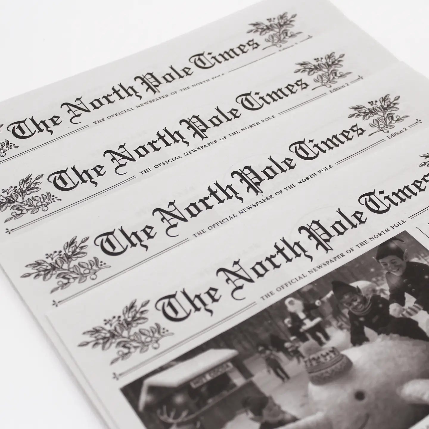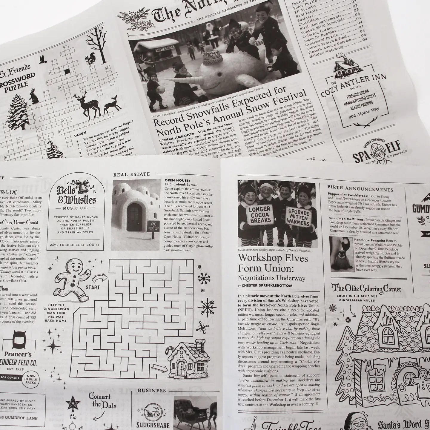 This adorable novelty newspaper is filled with fictional articles, activities, ads and more to explore! Package includes four full double-sided sheets on real newsprint. Use them for wrapping gifts, a holiday activity, stocking-stuffers, a Christmas Elf activity, or something that Santa leaves behind on Christmas Eve! The North Pole Times can also be used for Christmas décor on the mantel!