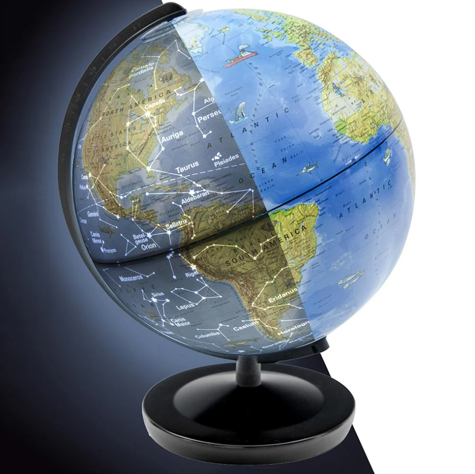 This ten-inch-diameter acrylic globe has a light inside, allowing it to function in two modes. In its non-illuminated day mode, the globe displays a detailed, exquisitely designed physical and political map of Earth. At a glance, you can see country borders, mountains, rivers, and more. When the internal illumination is switched on in night mode, a map image with the most important stars and constellations shines through from the inside, revealing a beautiful representation of the starry sky. A 20-page, full-color manual explains the globe’s features and includes useful information about geography and astronomy. The globe plugs into standard wall outlets and has an on-off switch on the cord.