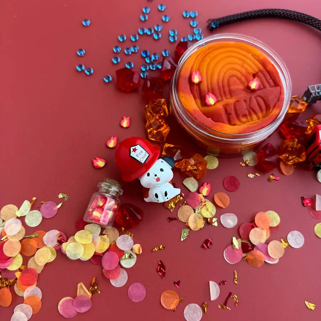 - Includes: 8 oz Red and Orange Marbled (Cherry Mango) KidDough, 2 Jars of Mix Ins (Fire and Water Beads), Dalmatian Puppy, Fire Hydrant, Red and Orange Acrylics.