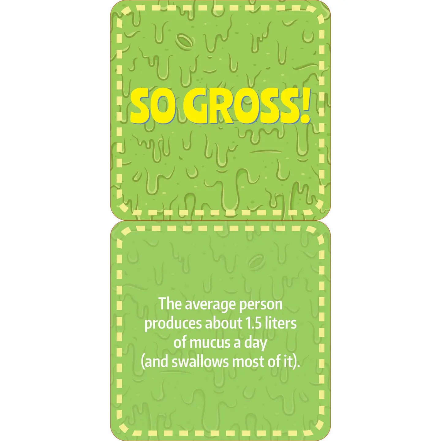 Fun and fact-filled lunch box note cards will acquaint kids with everything slimy, sticky, and stinky! Each card in this deck features skin-crawling facts that will captivate youngsters and make learning a blast! They'll discover everything they ever wanted to know about belly-button bacteria, farts, all kinds of poop, slug slime, and so much more. Set of 60 ick-inducing yet educational cards. Fronts of cards are coated. Parents can write personal notes on the uncoated card backs. Bright, bold, funny designs are sure to get a giggle. Cards come packaged in a reusable box. Cards have rounded corners for reduced wear. Cards measure 3-1/4'' square. Send smiles!