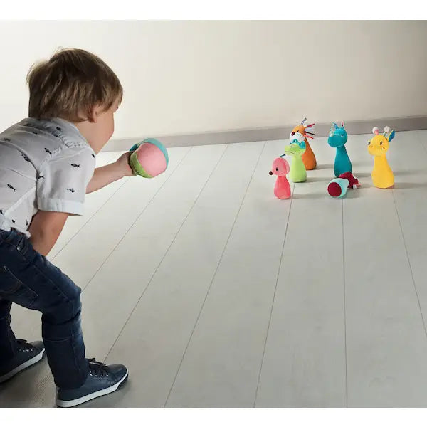 An invigorating bowling game that little ones just love. Soft and colorful jungle characters serve as pins and the ball has a rattle hidden inside for extra sensory stimulation.