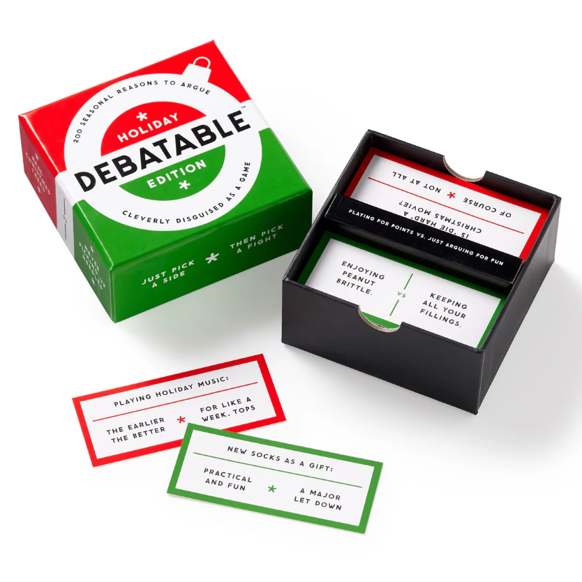It’s the most wonderful time of the year–to argue. I mean, you’re already going to bicker with your relatives, you might as well have fun while doing it. Includes 400 holiday-ish things to argue about and suitable for 2 or more players. In this holiday-specific version of Debatable, we’ll obviously avoid politics and religion, and instead focus on the important stuff like: Is Die Hard a Christmas movie? Which is better: fresh or canned cranberry sauce? Is peanut brittle the best thing on earth, or a tooth removal device disguised as candy?