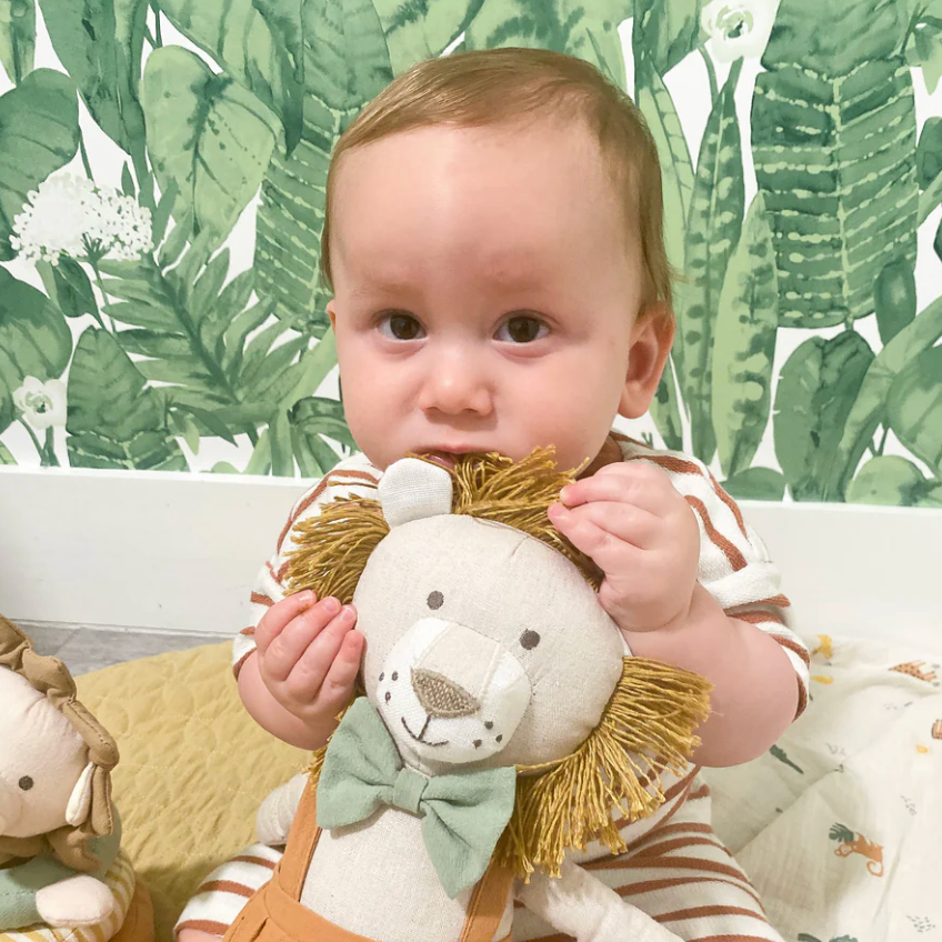 Leopold Lion Doll is ready to roar! Dressed with dapper bow tie and overalls, his charming embroidered face and tassely mane will delight you!