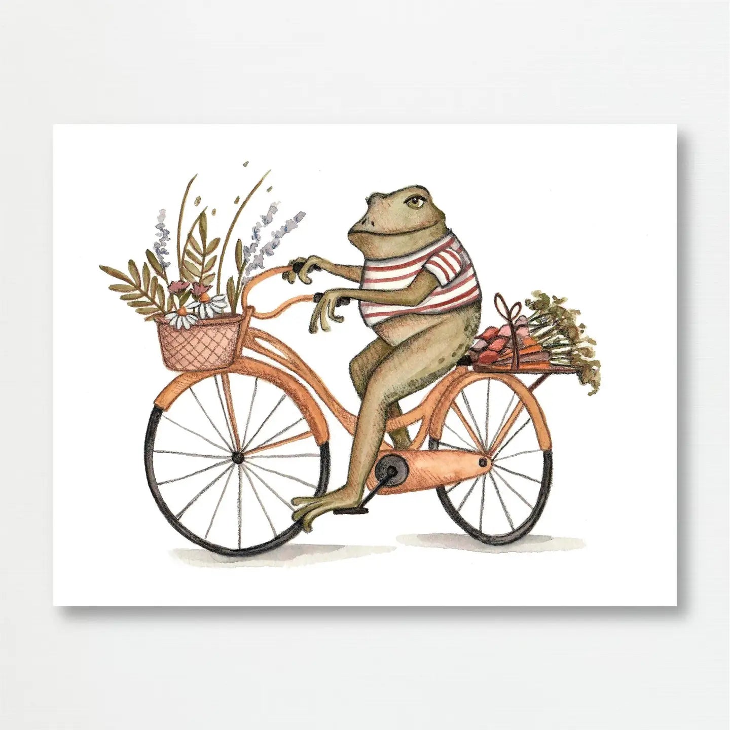 Wouldn't it be nice to be a frog riding a bicycle to market on a sunny Spring day? This art print is of an original gouache and colored pencil illustration.