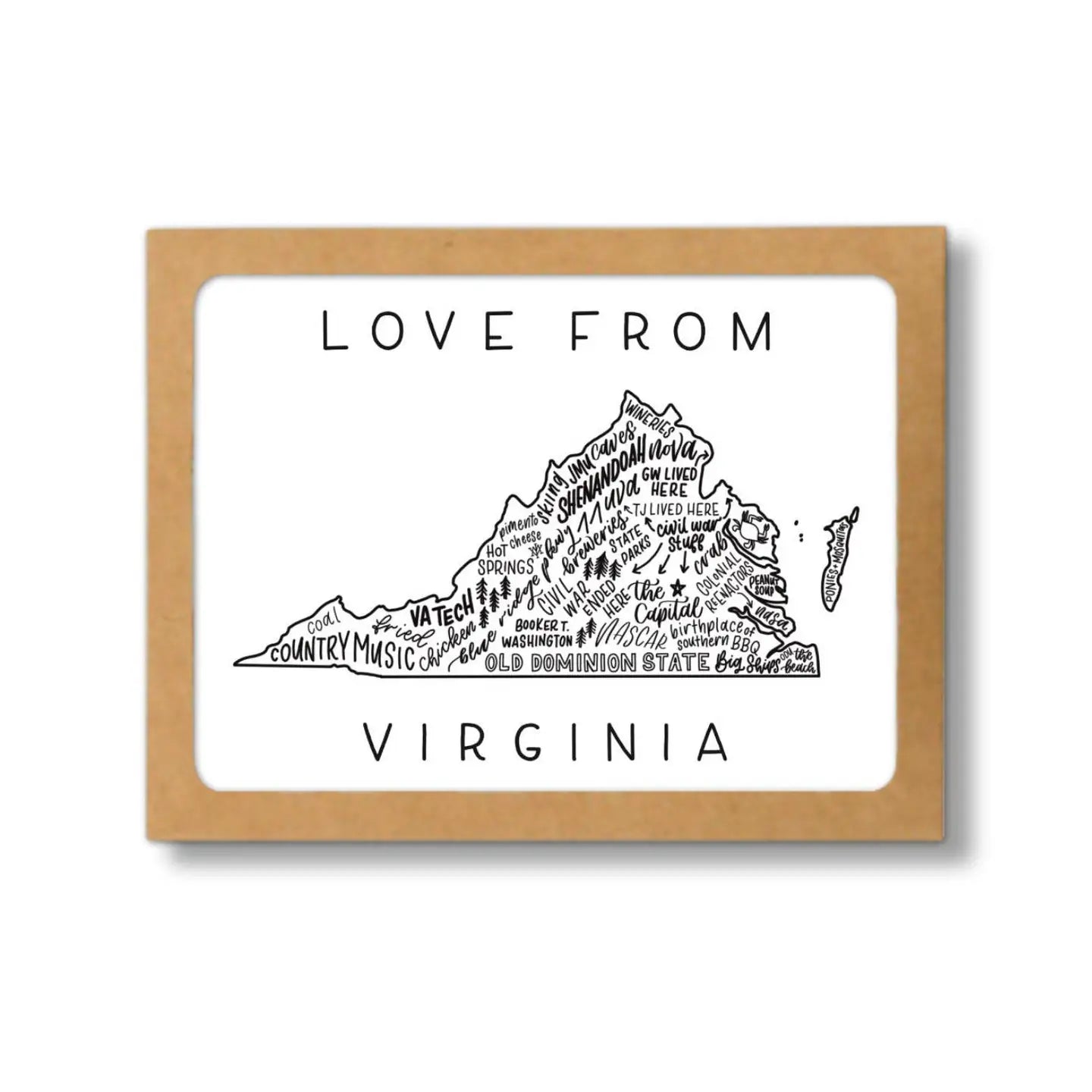 Introducing the bestselling Virginia state map greeting card by Shop Like You Live Here. Brimming with delightful, hand-drawn details, this set of all occasion greeting cards celebrates the beauty and quirks of life in Virginia — from historic universities to the ponies and mosquitoes of the Eastern Shore.