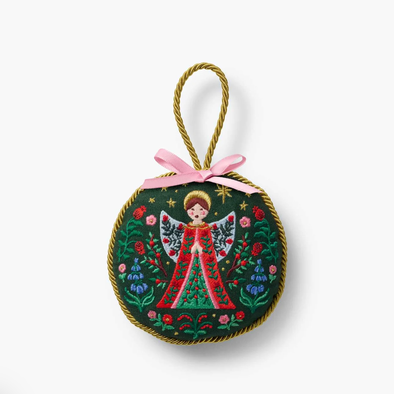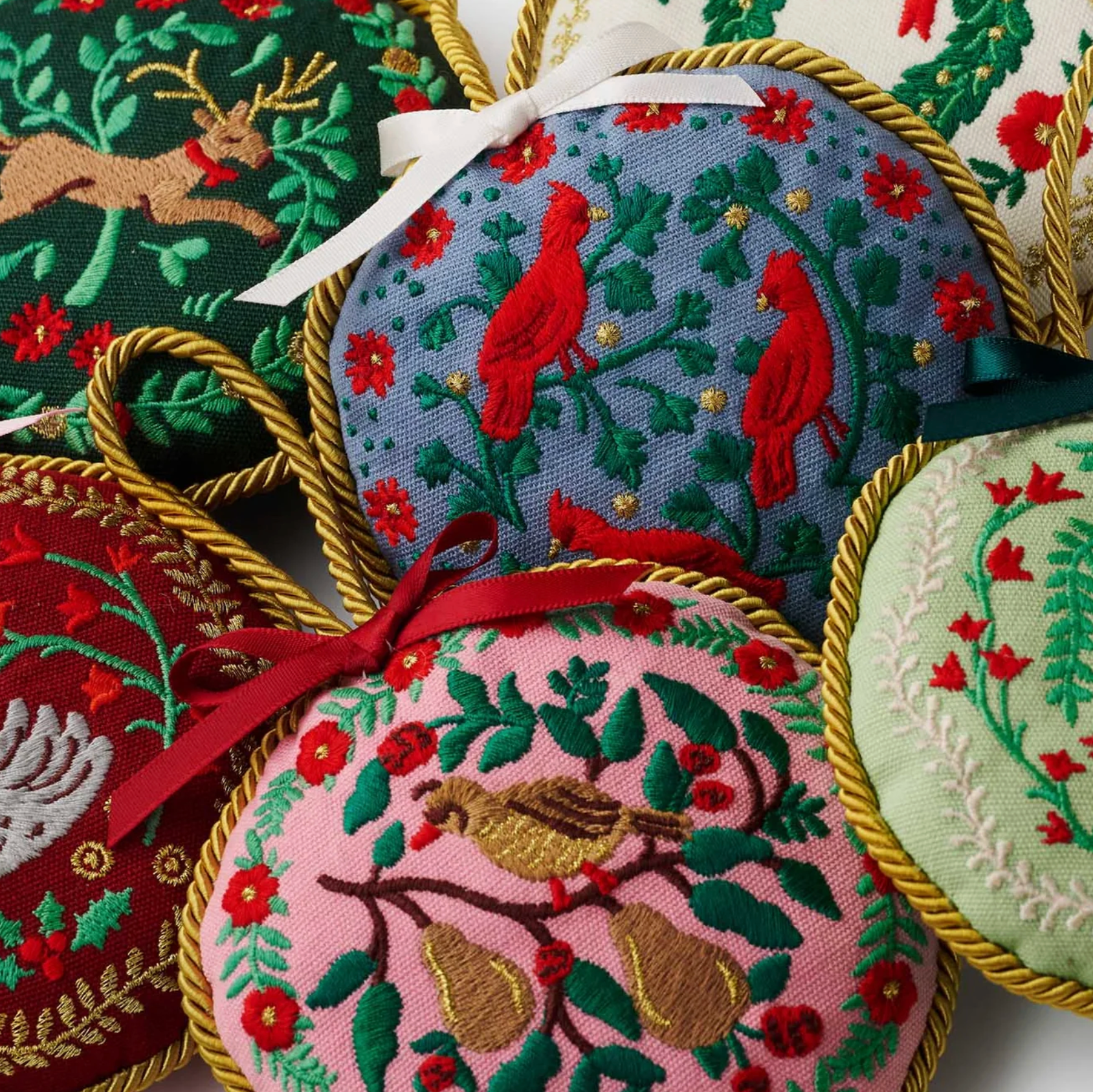 An instant keepsake for trimming your tree, or a special gift they’re sure to cherish. These embroidered ornaments features a Christmastide illustration with gold thread detailing, twisted piping, and velvet bows.