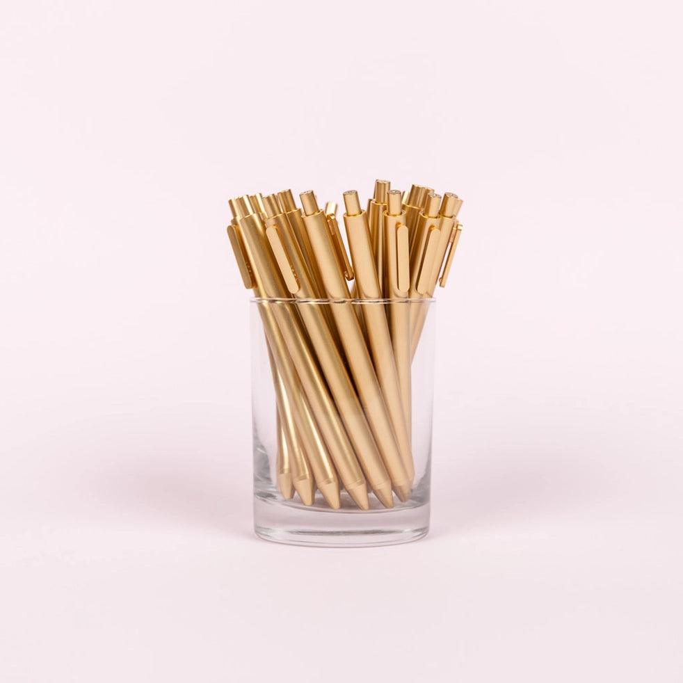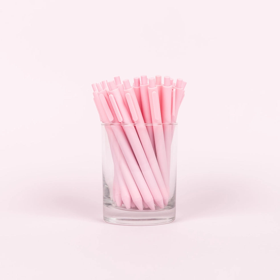 Pens have a smooth gel ink color that matches their barrel color, with the exception of Navy, Gold, White, Grey, and Metallic barrels, which have black ink.